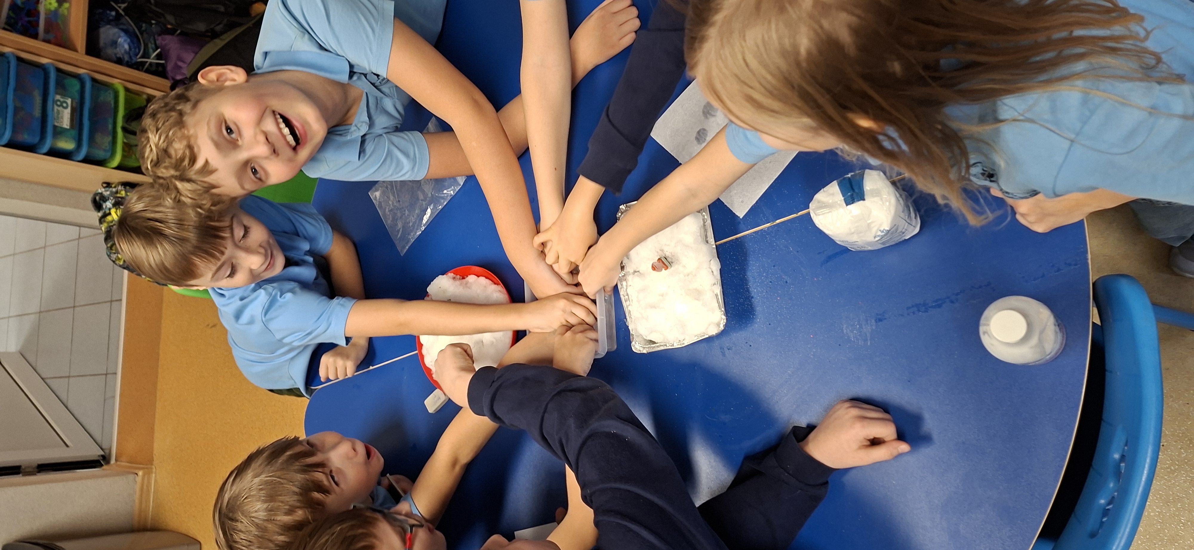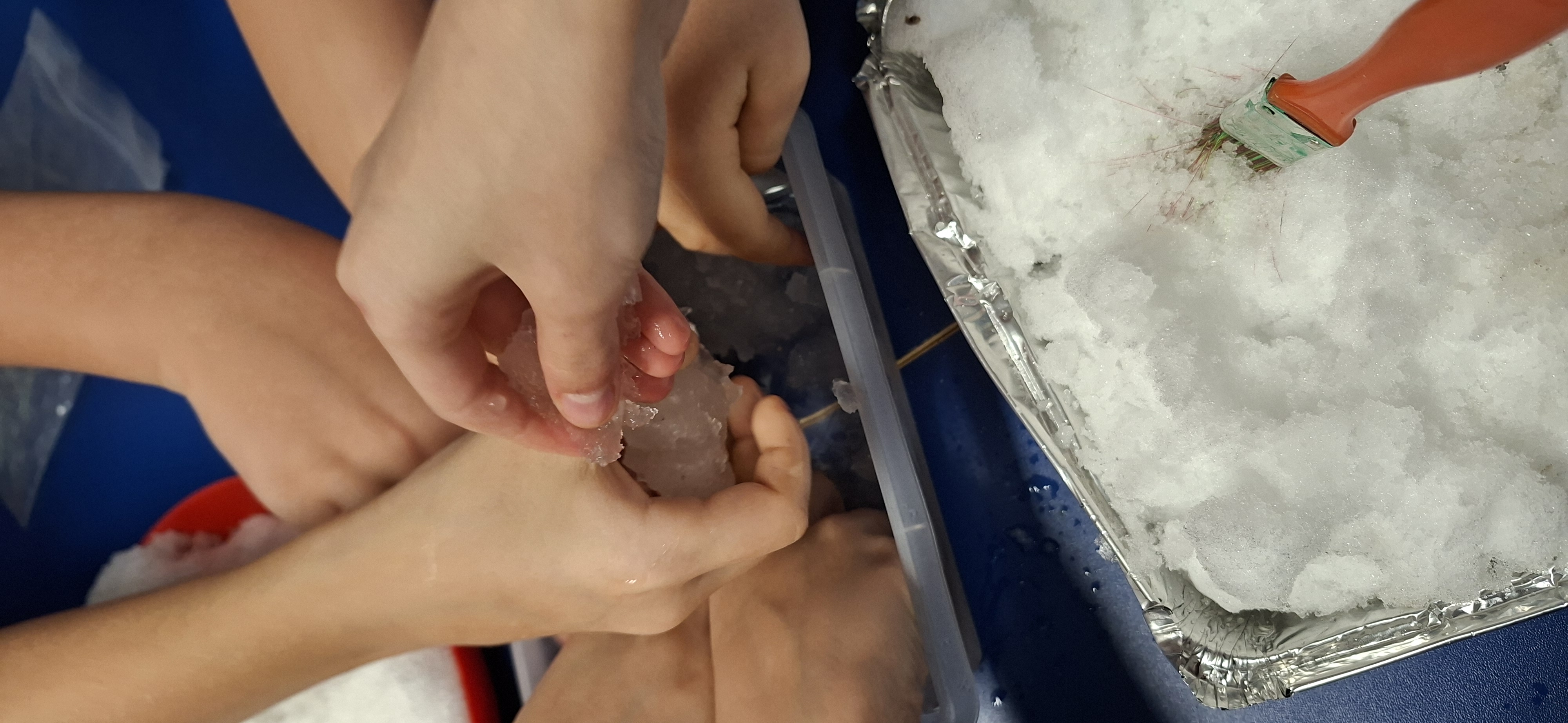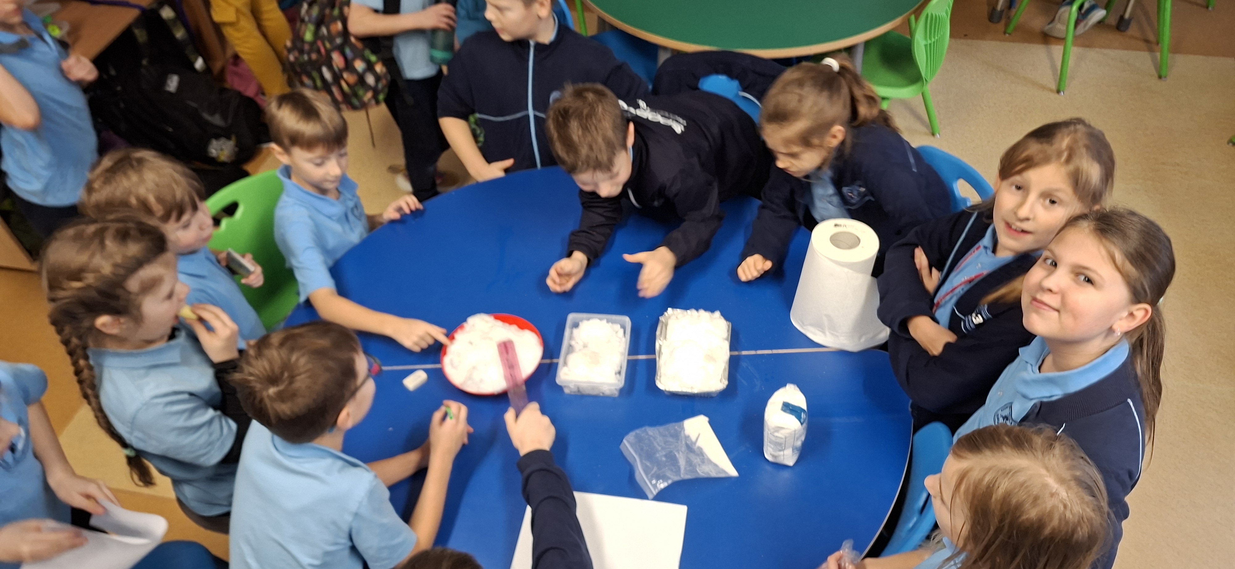 Gdy już zimno dało sie we znaki, uczniowie zabrali do szkolnej świetlicy trochę śniegu i wykonały doświadczenia z jego roztapianiem.