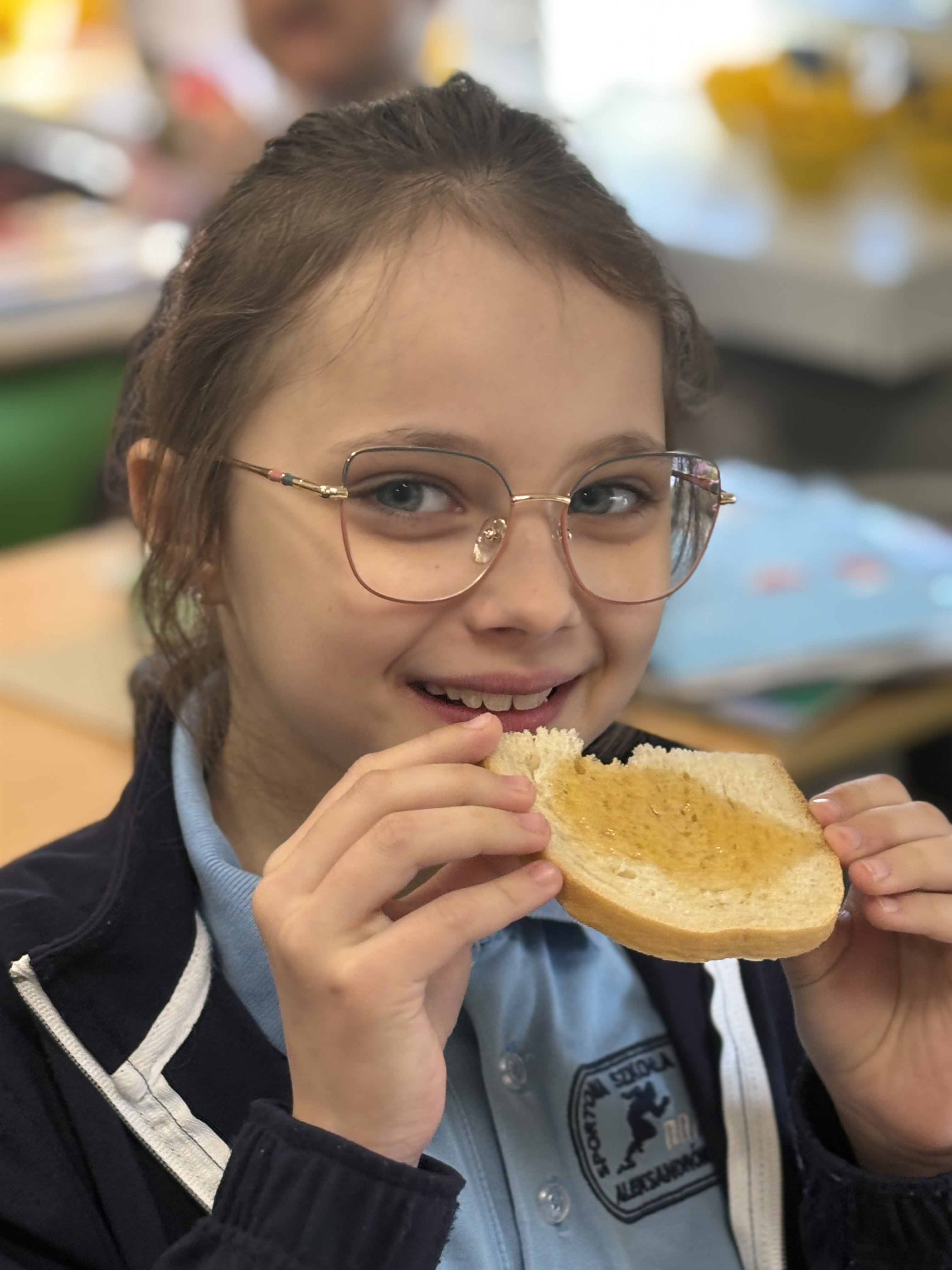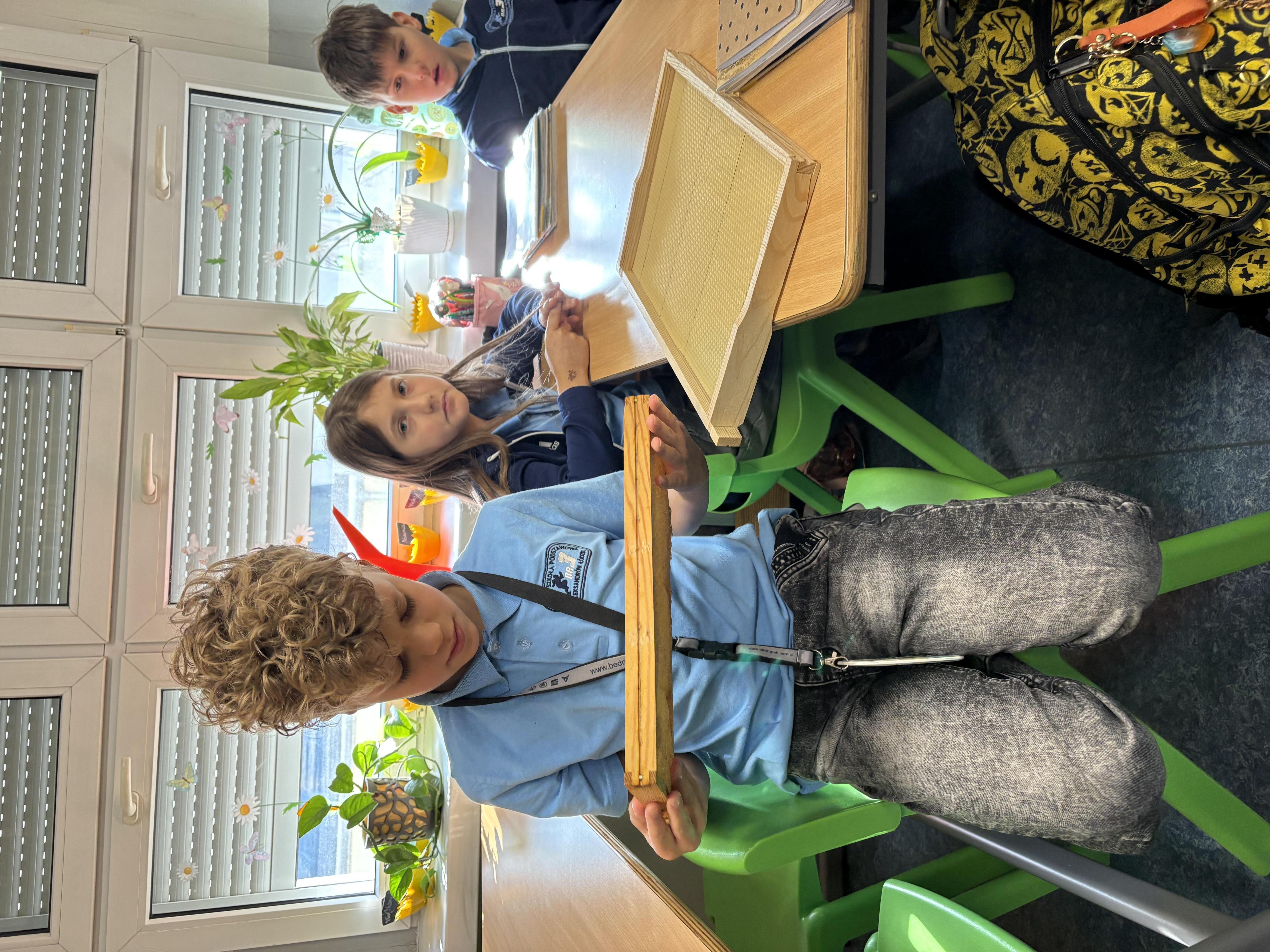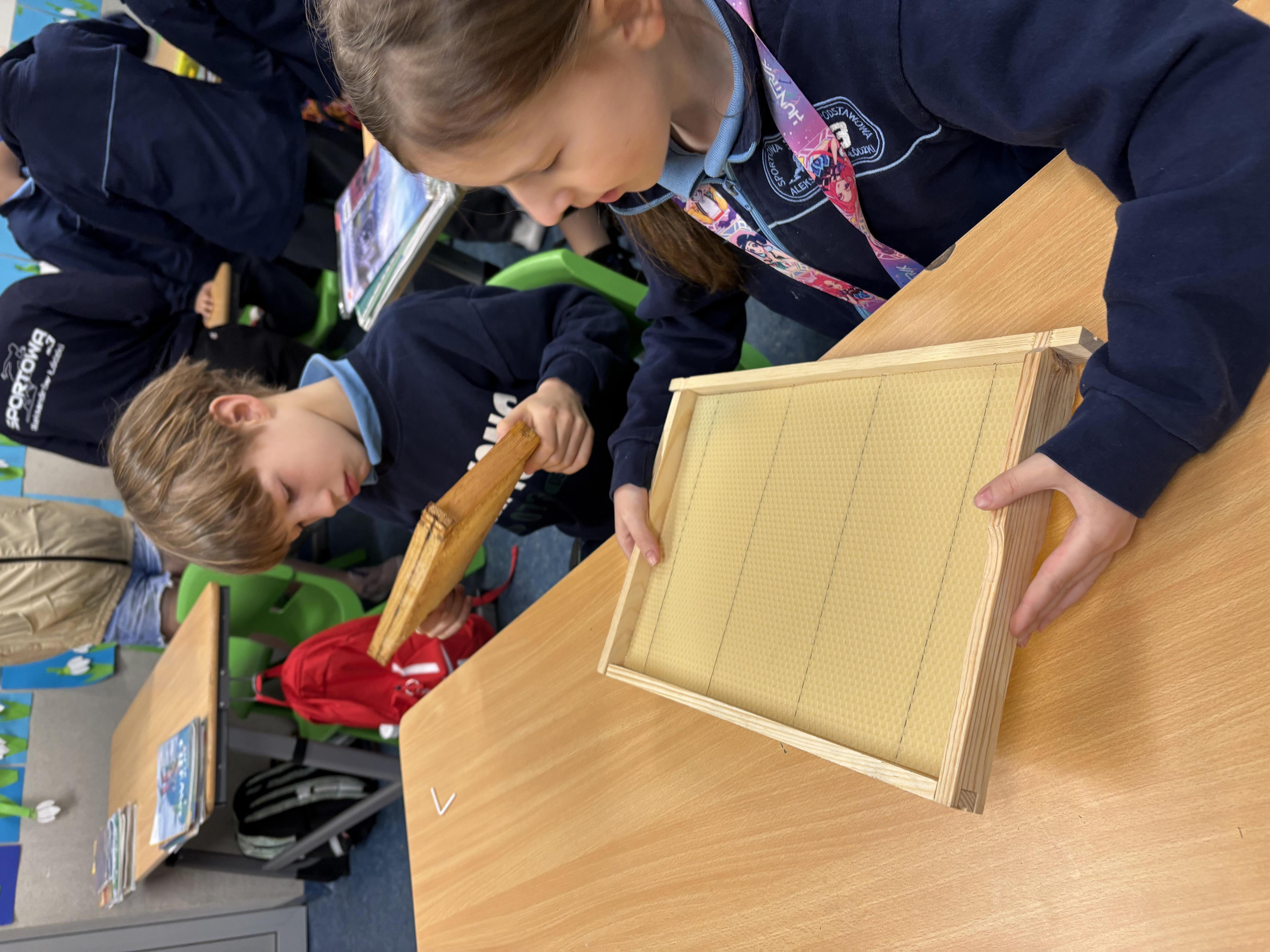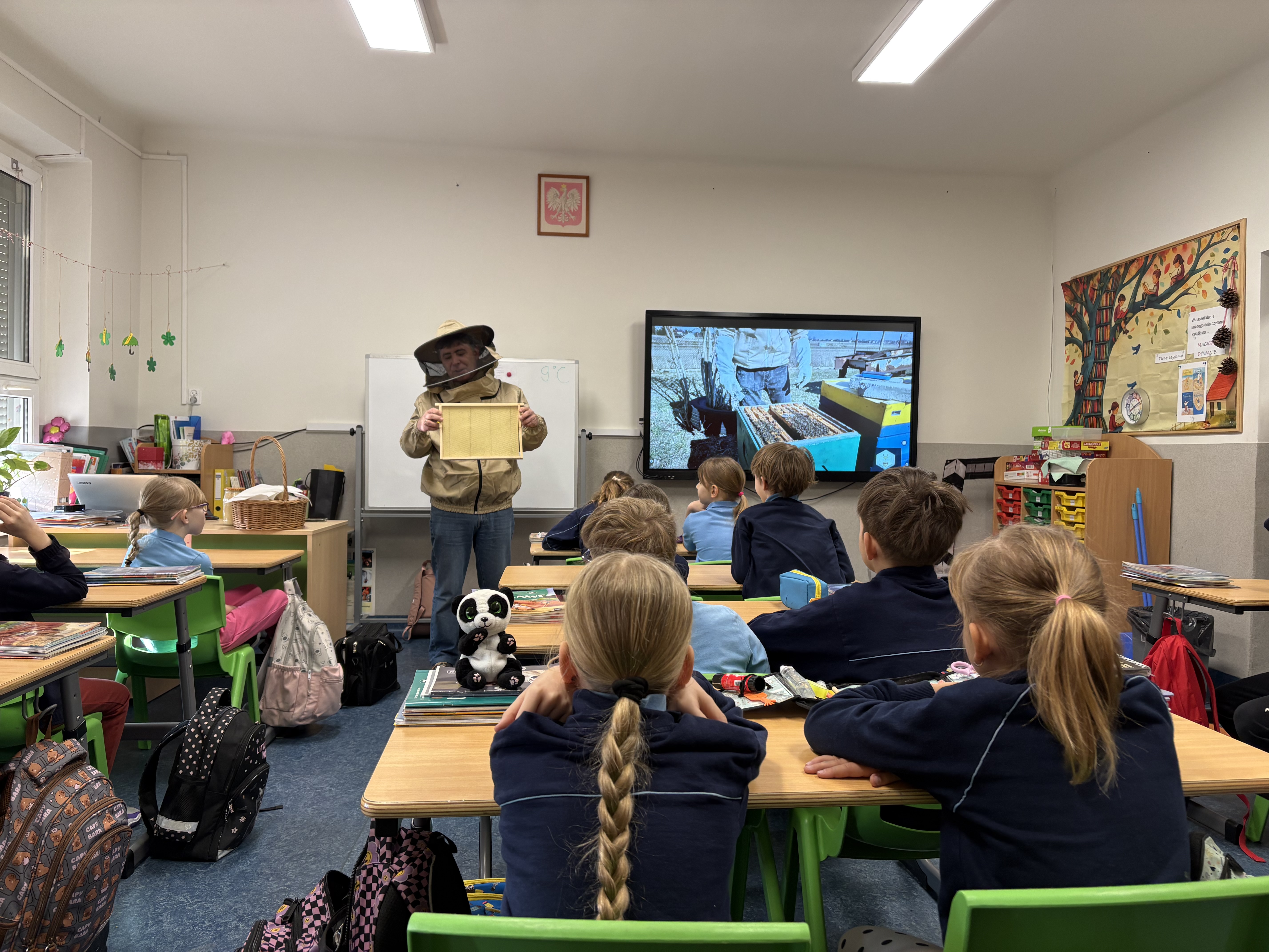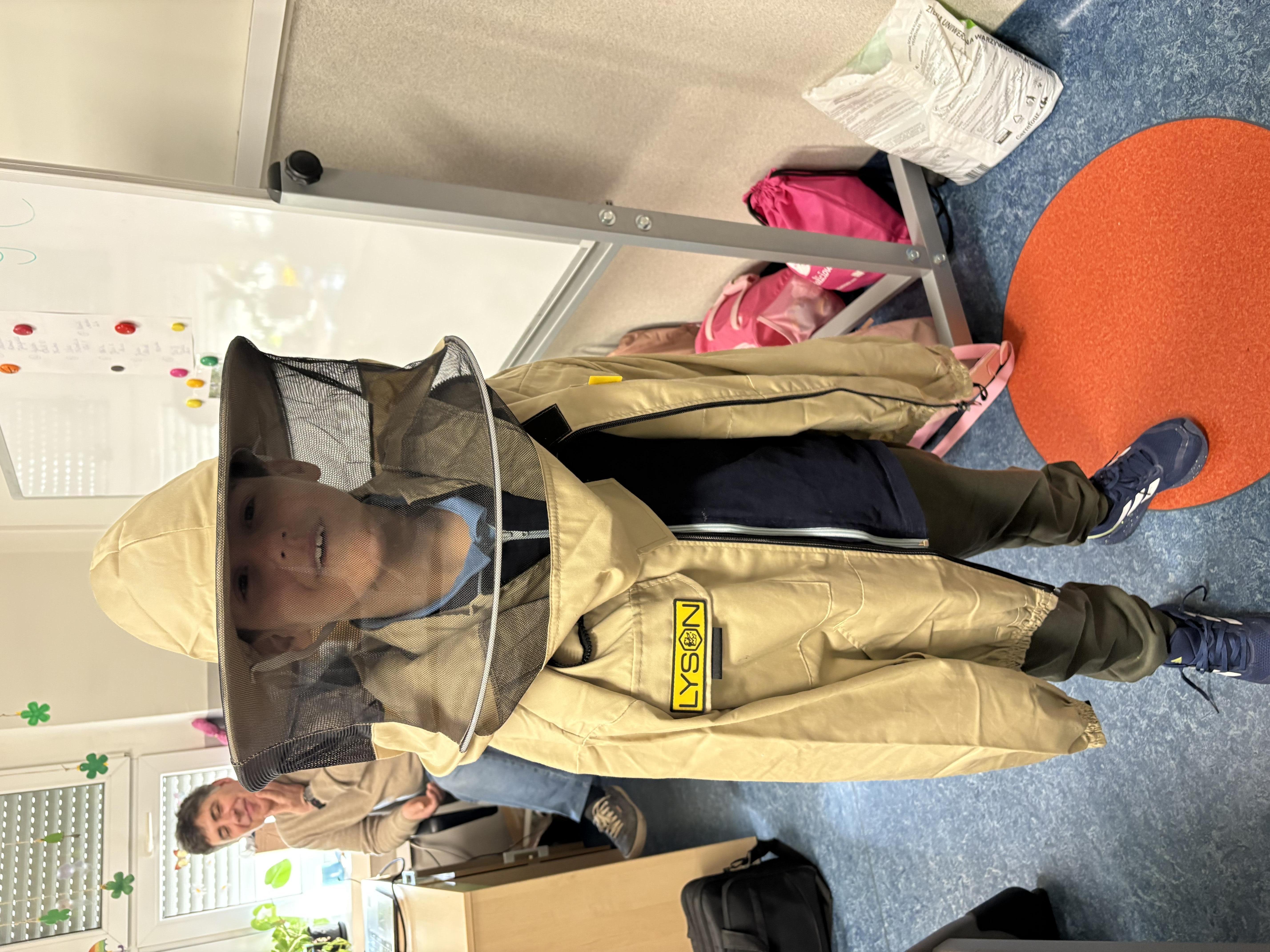 W dniu 18 marca braliśmy udział w bardzo ciekawej lekcji. Otóż odwiedził nasz pszczelarz. Pan Sławomir Szczepaniak na codzień jest nauczycielem fizyki w naszej szkole. Znamy go ze szkolnych korytarzy. Tym ciekawiej było poznać jego drugą pasję. Bardzo ciekawie opowiedział nam życiu pszczół i ich zwyczajach. Dowiedzieliśmy się, jak wygląda podział ról w ulu - czym zajmuje się królowa, robotnice i trutnie. Wiemy też, jak ważne są pszczoły w życiu człowieka. Mogliśmy zobaczyć sprzęt i narzędzia, którymi posługuje się pszczelarz. Dowiedzieliśmy się, jak powstaje miód. Na końcu mieliśmy okazję spróbować pyszne kanapki z miodem prosto z pasieki pana Sławka oraz przymierzyć jego niesamowity strój.