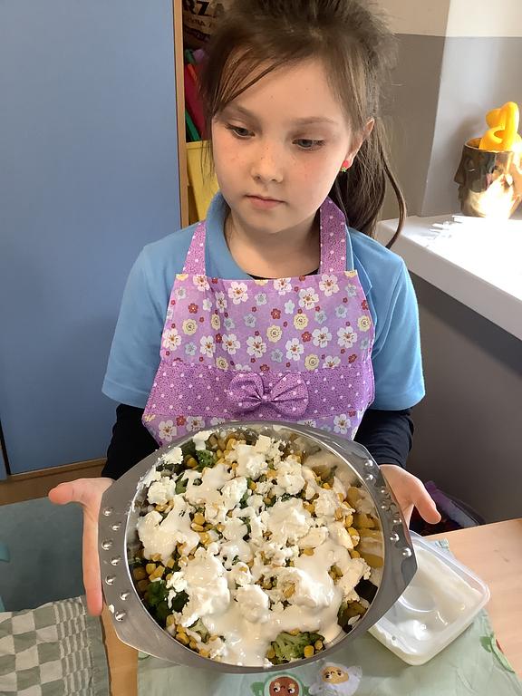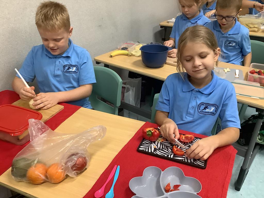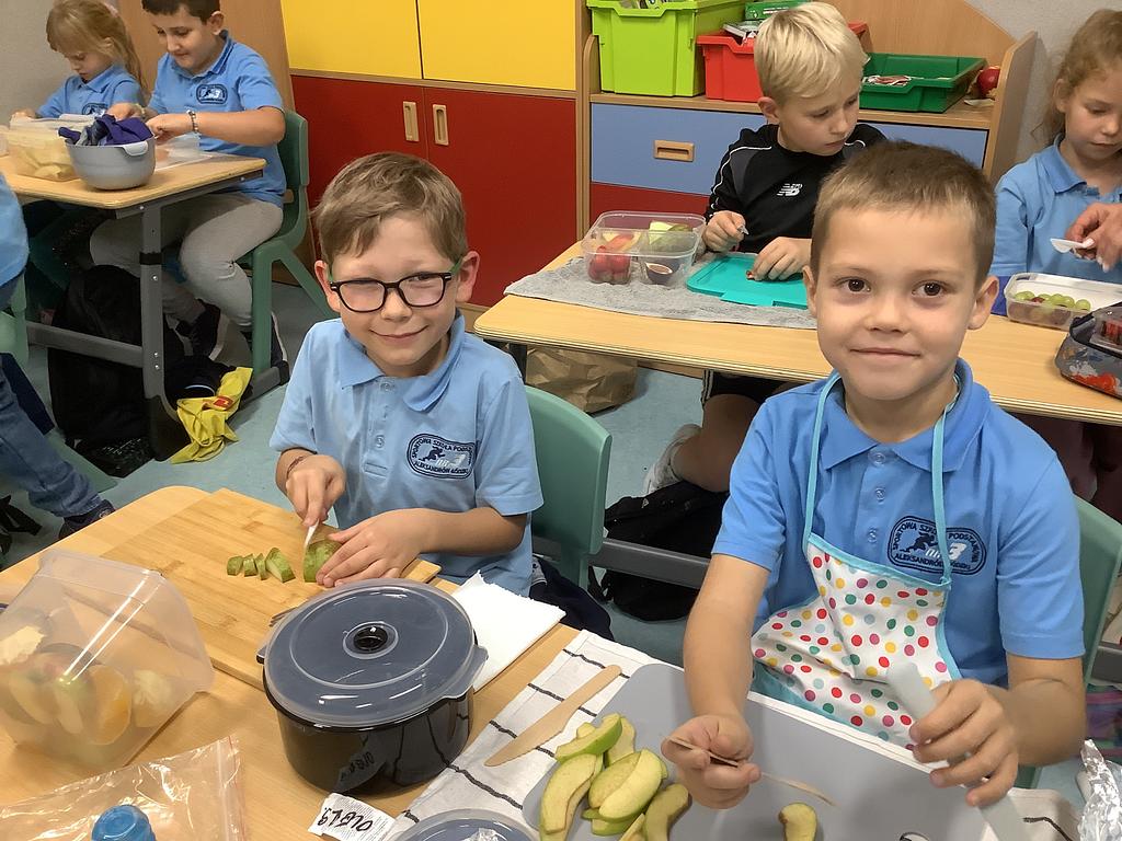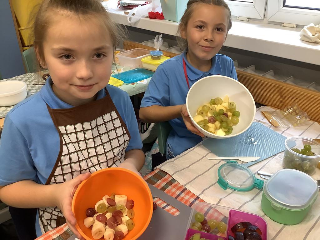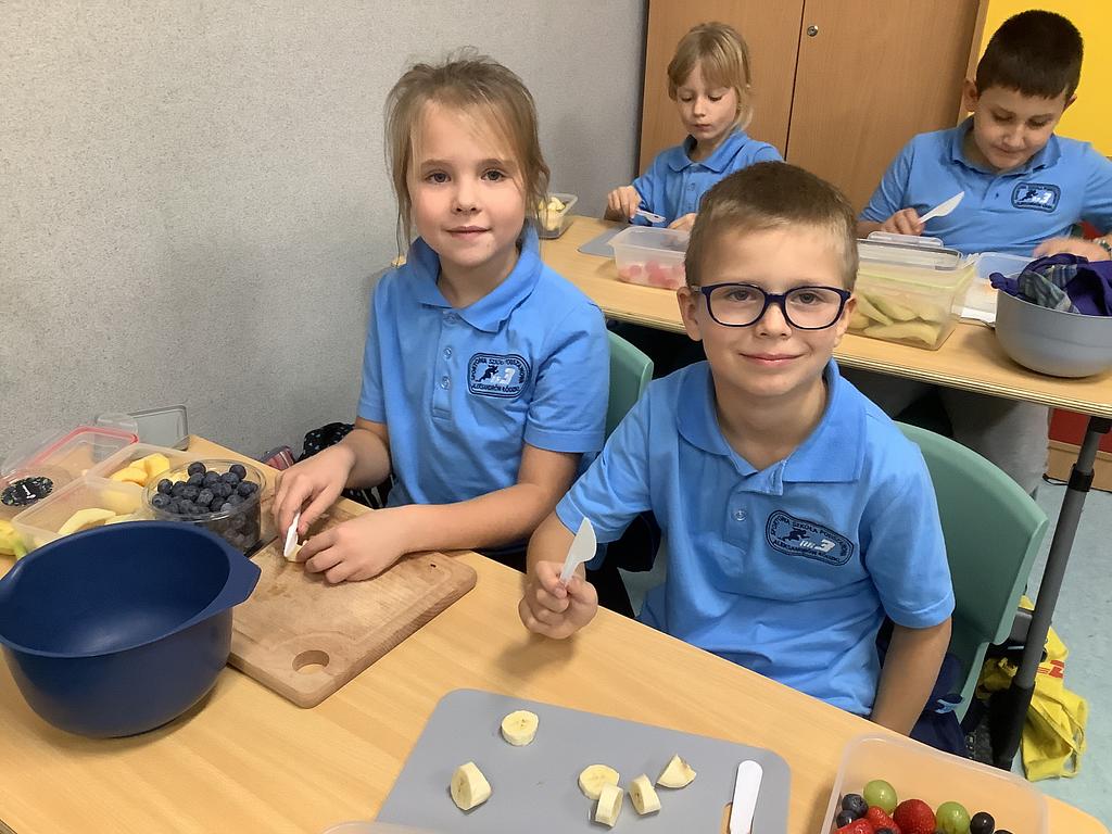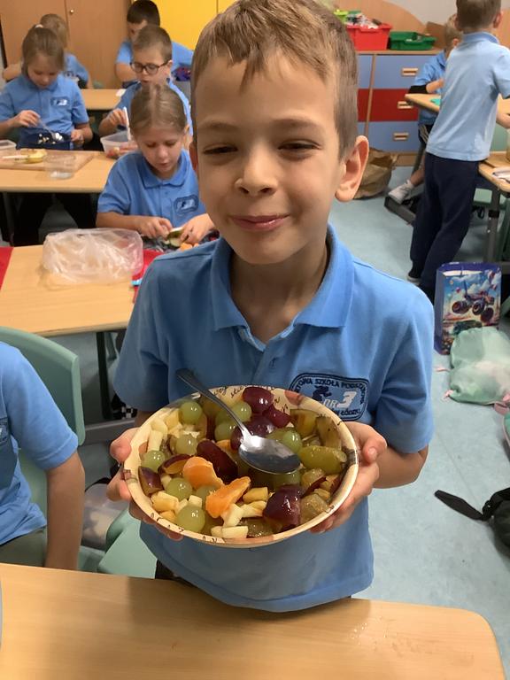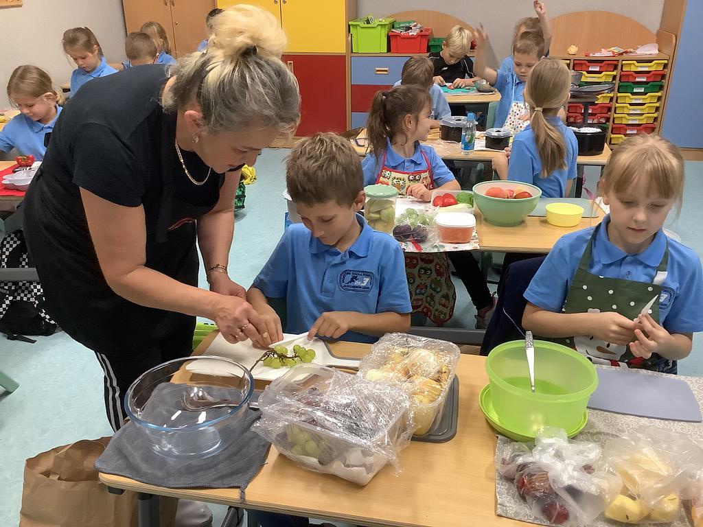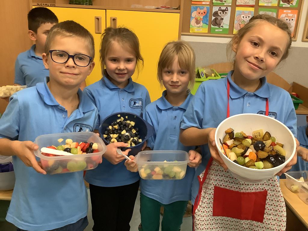 Dziś na deser przygotowaliśmy przepyszne sałatki warzywno-owocowe. Z pomocą przyszła nam szefowa naszej szkolnej kuchni, pani Ania, która chętnie podzieliła się swoją wiedzą i doświadczeniem. Przy okazji dzieci dowiedziały się, jakie korzyści płyną ze spożywania warzyw i owoców. To była nie tylko smakowita, ale i bardzo pouczająca, kilinarna lekcja!