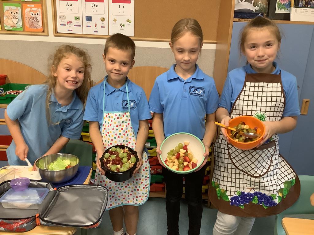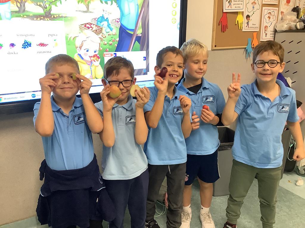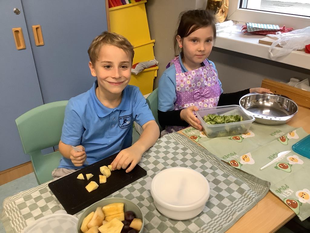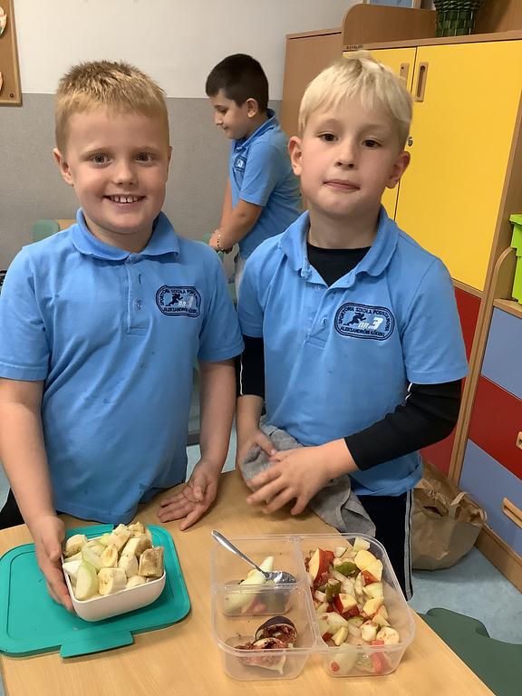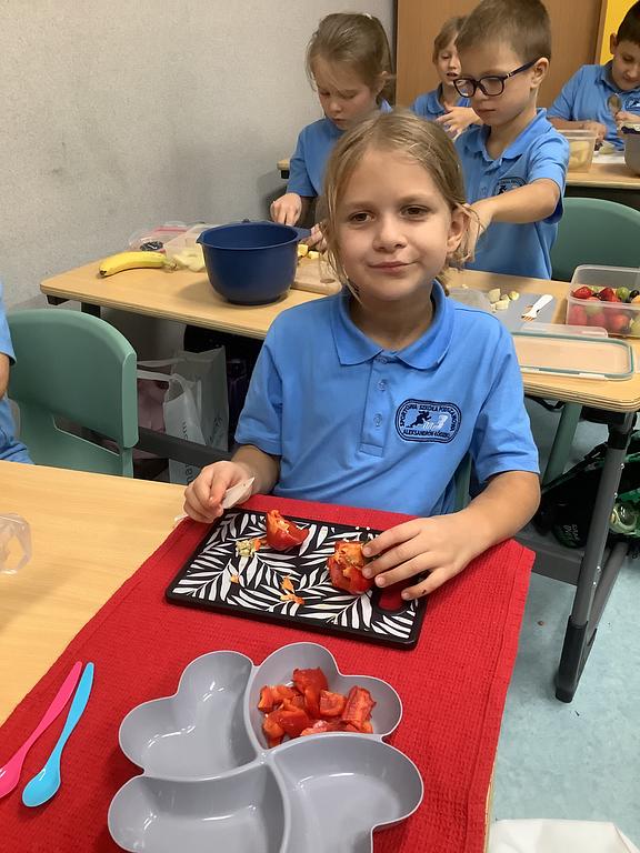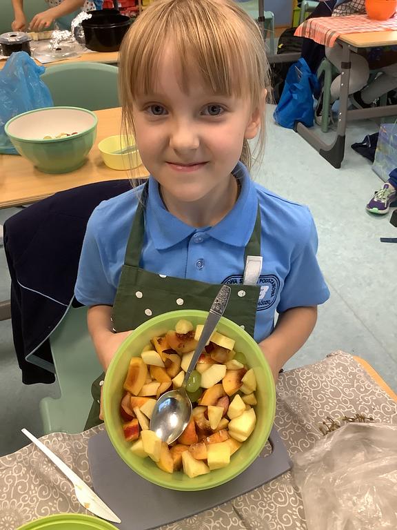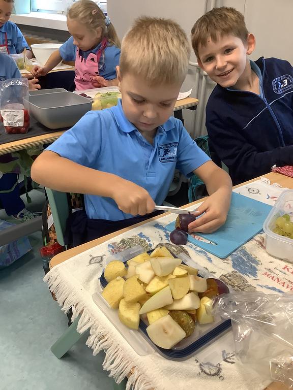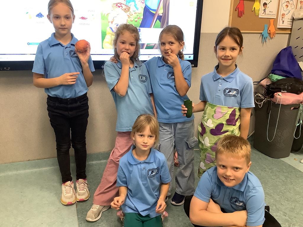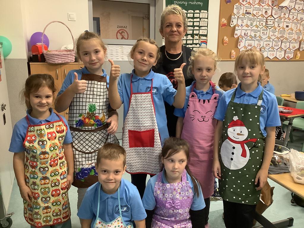 Dziś na deser przygotowaliśmy przepyszne sałatki warzywno-owocowe. Z pomocą przyszła nam szefowa naszej szkolnej kuchni, pani Ania, która chętnie podzieliła się swoją wiedzą i doświadczeniem. Przy okazji dzieci dowiedziały się, jakie korzyści płyną ze spożywania warzyw i owoców. To była nie tylko smakowita, ale i bardzo pouczająca, kilinarna lekcja!