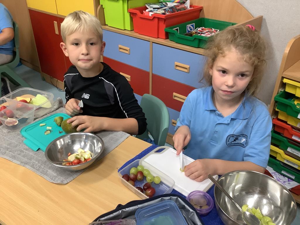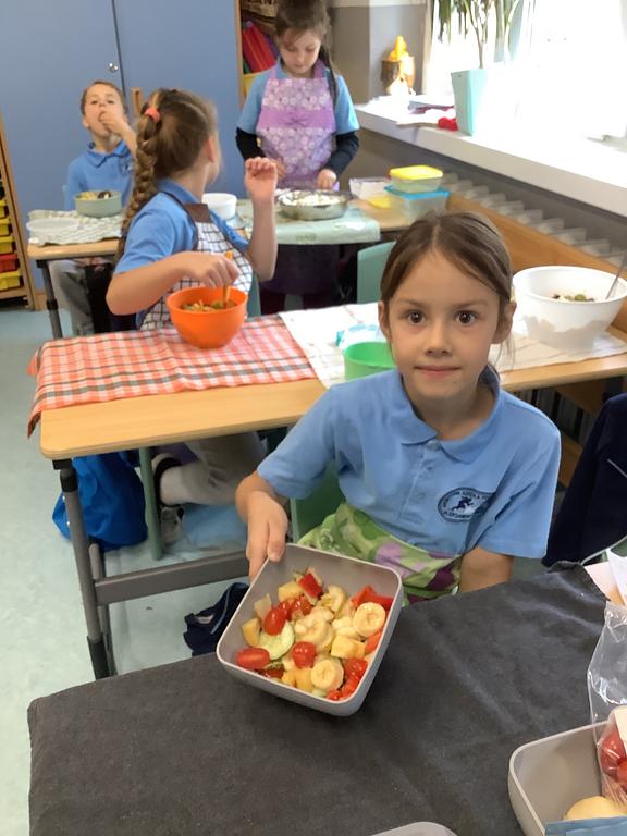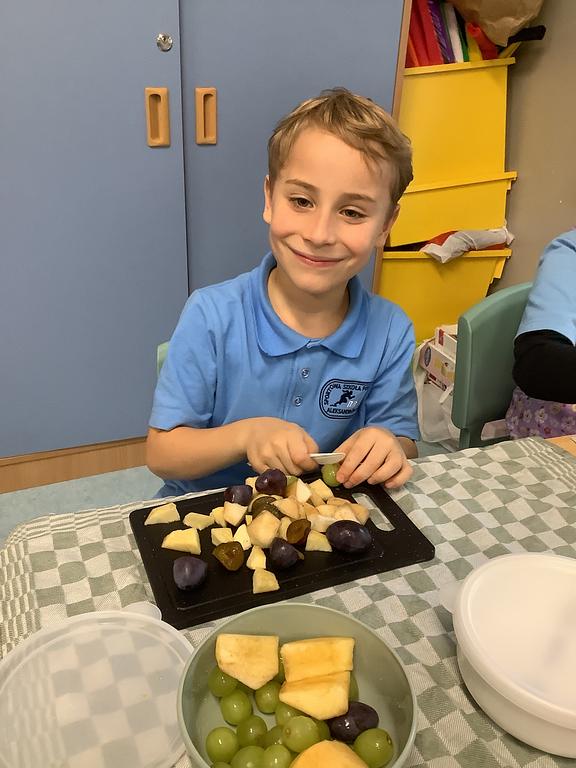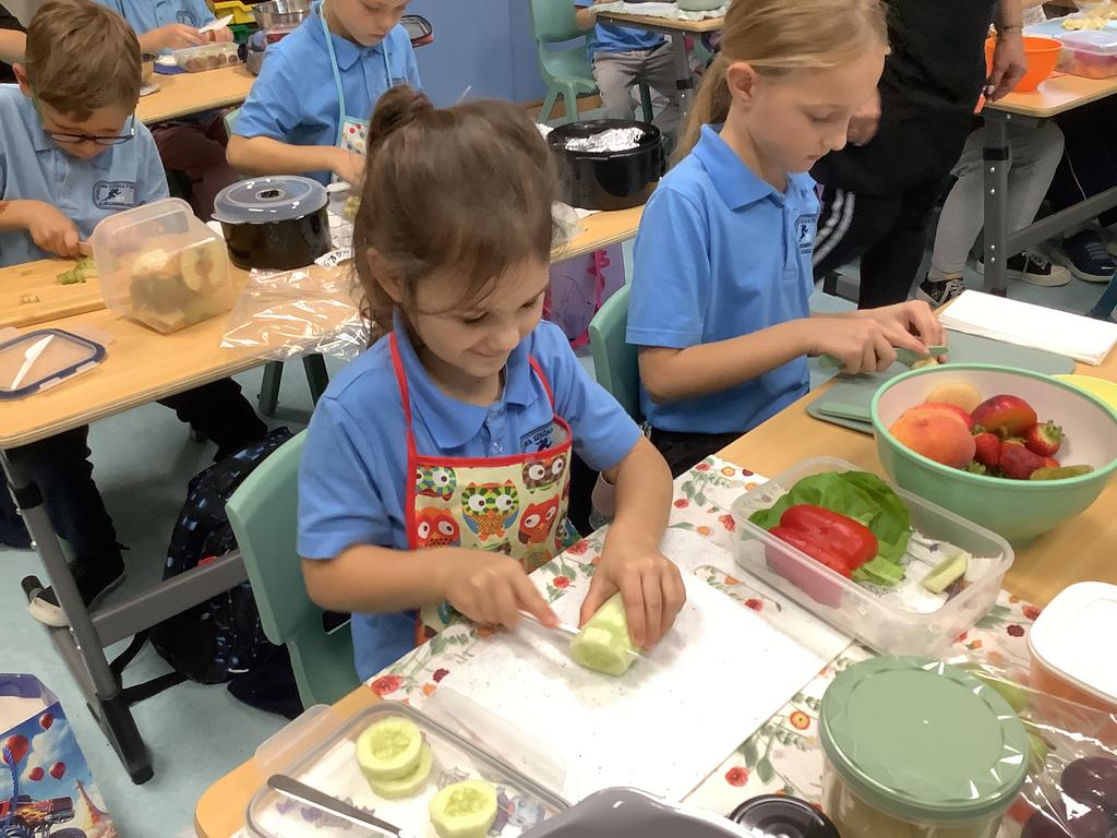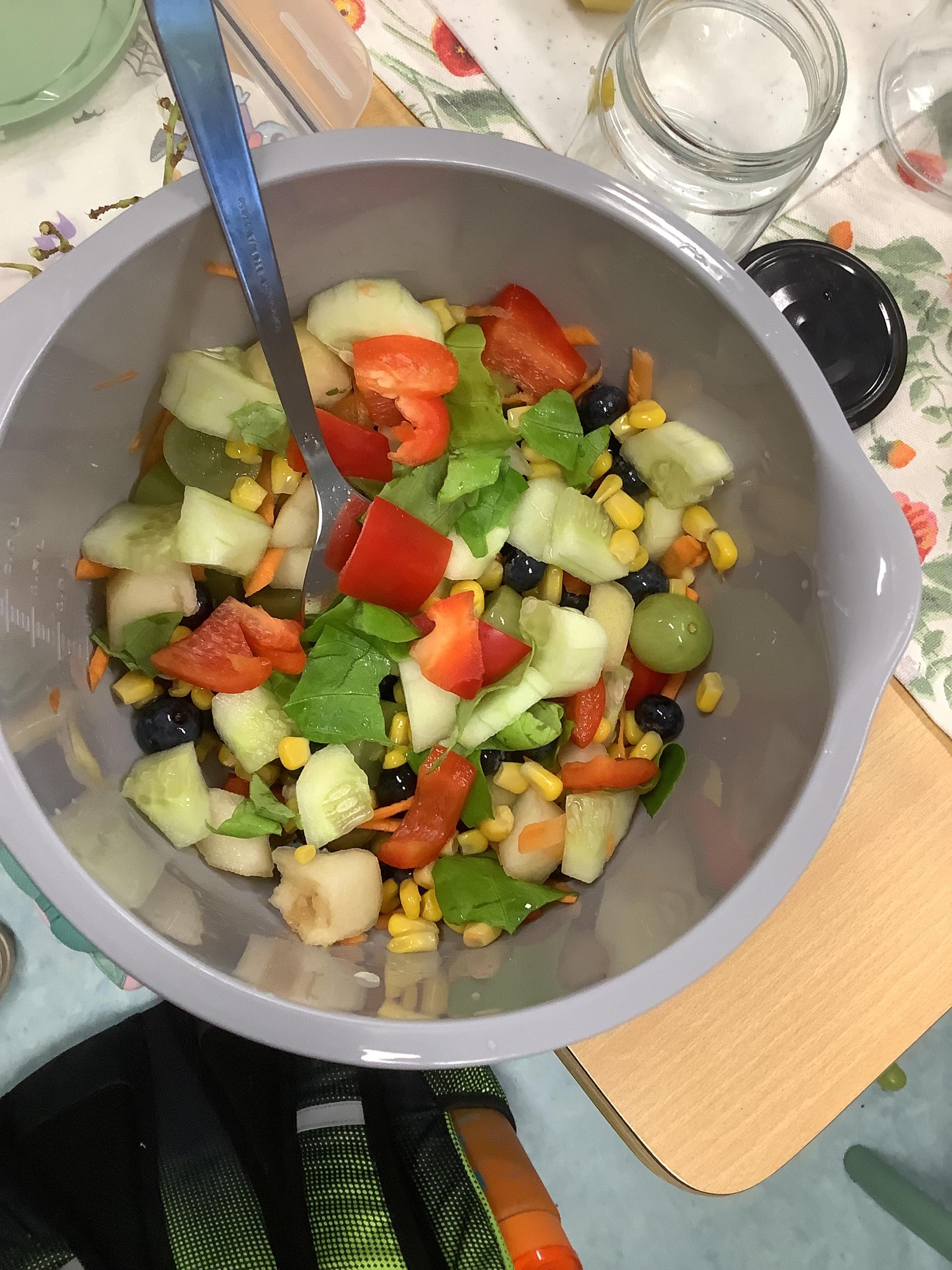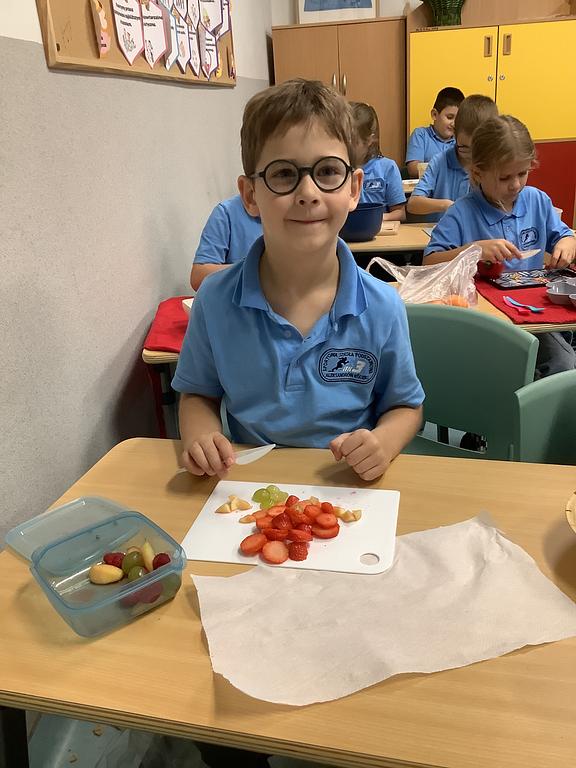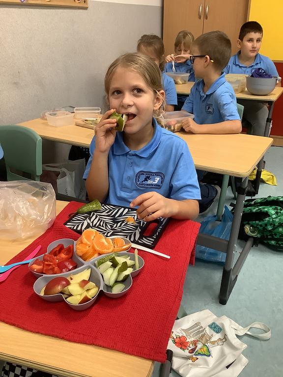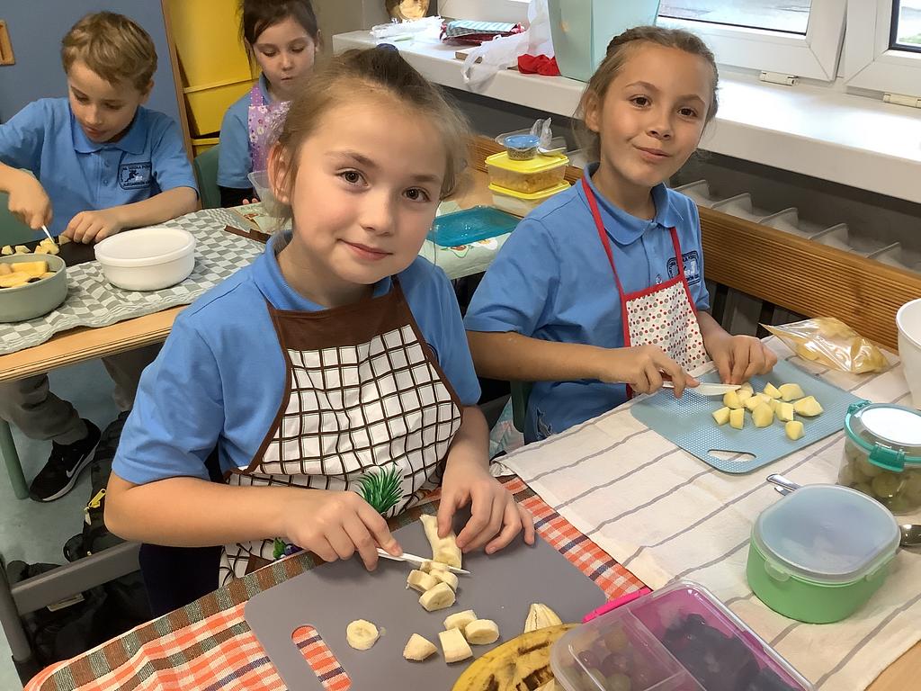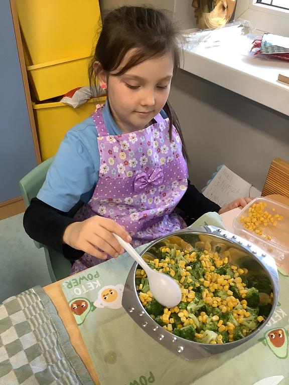 Dziś na deser przygotowaliśmy przepyszne sałatki warzywno-owocowe. Z pomocą przyszła nam szefowa naszej szkolnej kuchni, pani Ania, która chętnie podzieliła się swoją wiedzą i doświadczeniem. Przy okazji dzieci dowiedziały się, jakie korzyści płyną ze spożywania warzyw i owoców. To była nie tylko smakowita, ale i bardzo pouczająca, kilinarna lekcja!